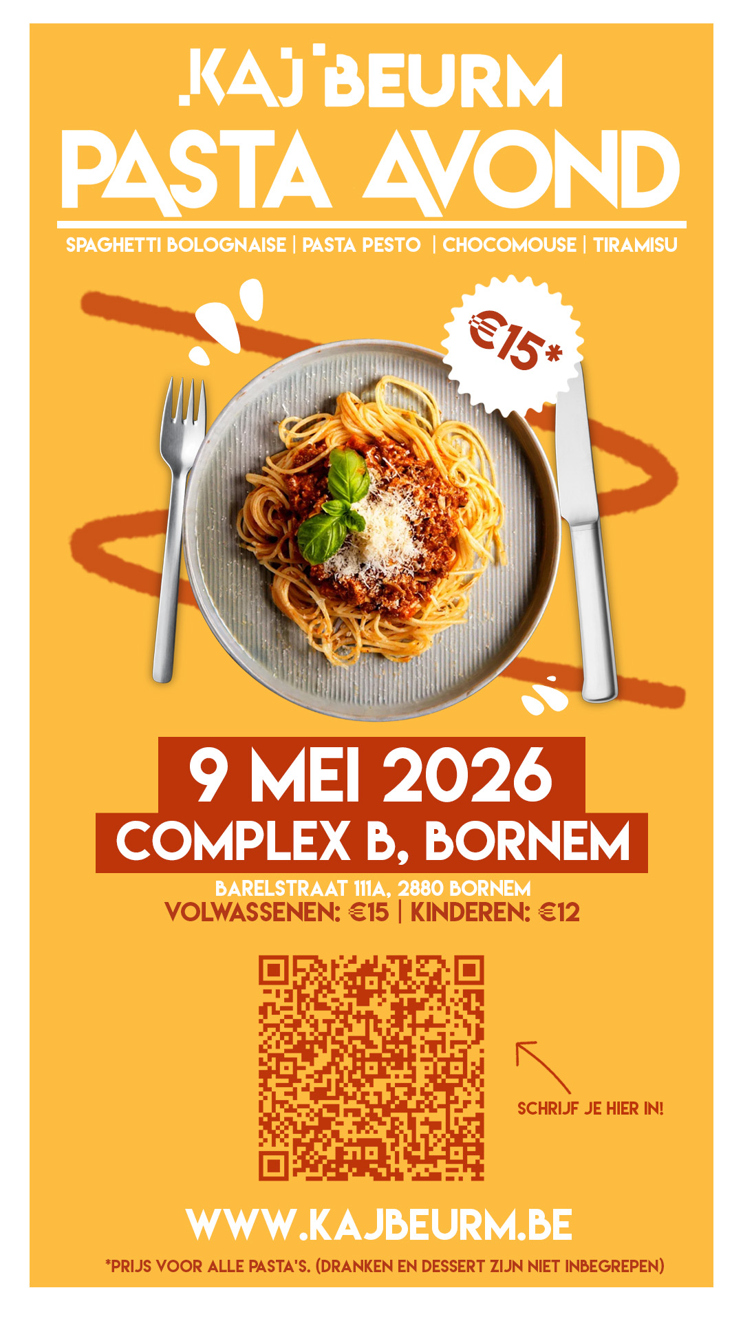 Ook dit jaar organiseren we een Pasta Avond. Deze keer vindt deze plaats in Complex B. Wil je ons nog meer steunen? Schuif dan zeker aan voor een lekker bordje spaghetti bolognaise of pasta pesto. En die zelfgemaakte chocomouse is heeeeerlijk!